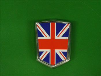 センターにユニオンジャックのステッカーが貼られた、フロントエンブレムです。取り付けは3本爪にてボンネットの穴に差し込む方式です。 |