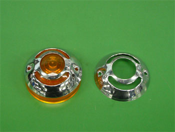 1986年から純正で仕様されている大型フラッシャーランプの上に被せるクロームのカバーです。レンズを止めるネジに取り付け致します。写真のレンズは付属致しません。 |
