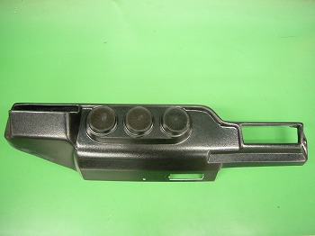 インダッシュクーラー車のエバポレーターカバーを外して装着致します。52mmメーターが3つ装備出来ます。その他フットライトやシガライターソケット等を付けるのも良いのではないでしょうか。小さなポケットも付いております、FRP製黒ゲルコート仕上げですのでお好きな色でペイントして下さい。メーターの穴は開いた状態でお届けとなります。 |