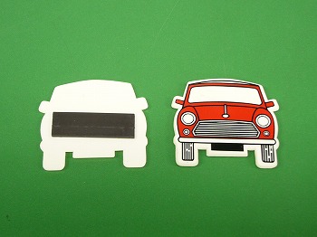 ミニの形をしたプラスチック製マグネットです。サイズは約5.4x5cmです。 |