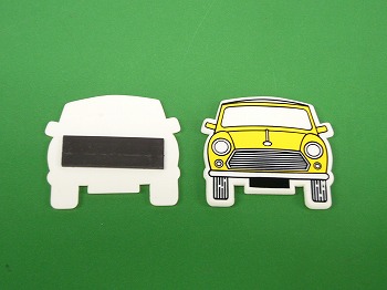 ミニの形をしたプラスチック製マグネットです。サイズは約5.4x5cmです。 |
