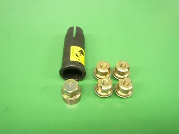 純正アルミホイールに取付されているロックナットのセットです。ロックナットと取外し工具が一式セットになっております。 |