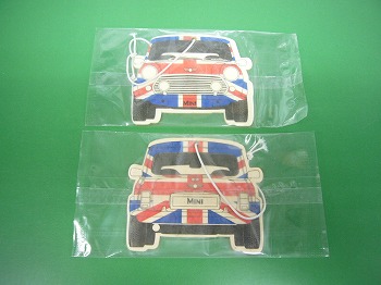 ユニオンジャックのミニが前後にプリントされた芳香剤です。バックミラーから吊るします。商品は1つの価格となります。 |