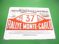 | 1964年に初めてモンテカルロラリーに優勝した時のゼッケンプレートのレプリカです。アルミプレートにプレス加工がされていて忠実に当時のプレートを再現しております。写真台座付ですのでコレクションやプレゼントにも喜ばれると思います。サイズは約44.5x20cmです。 |