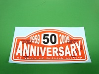 | 50周年を記念して製作された外張りステッカーです。裏の紙を剥がして貼り付け良く擦った後に表の紙を剥がせばゴールドの文字のみが残ります。サイズは約11x7.2cmです。 |