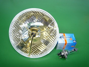 ルーカスP700ヘッドランプのレプリカです。スリーポイントと中のシェードがゴールドになっています。ハロゲンH4バルブにスモールポジション付きです。ルーカスのロゴは入っておりません。 |