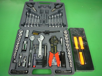 119ピースの工具セットです。ミリとインチのスパナ、ボックス、ドライバー、ニッパ、ペンチ、プラグレンチ、配線キットに検電器まで付いてこの価格です。愛車のトランクに是非入れておいて下さい。 |