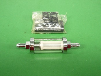 ガソリンホースの間に取り付けが可能なフューエルフィルターです。ガラスケースで汚れの確認も容易です。サイズが小さいのでスペースも選ばずに取り付け出来ます。ホース接続部分のサイズは1/4です。 |