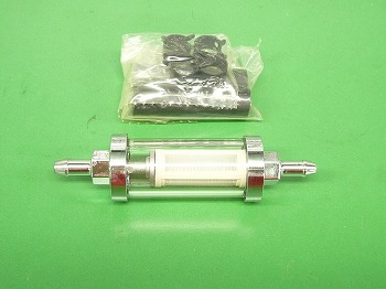 ガソリンホースの間に取り付けが可能なフューエルフィルターです。ガラスケースで汚れの確認も容易です。サイズが小さいのでスペースも選ばずに取り付け出来ます。ホース接続部分のサイズは5/16です。 |