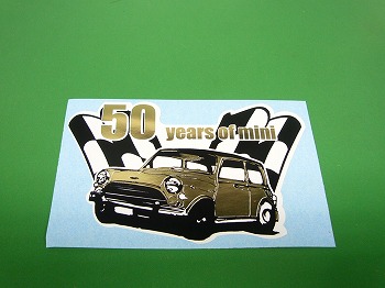 50周年記念ステッカーでゴールドのミニとチェッカーフラッグのデザインです。サイズは約14.4x9cmです。 |