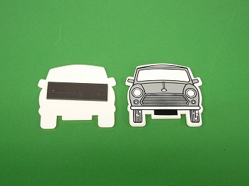 ミニの形をしたプラスチック製マグネットです。サイズは約5.4x5cmです。 |