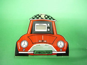ジョンクーパーロゴ入りデジタルクロックです。吸盤付き電池は別途お買い求めください。 |